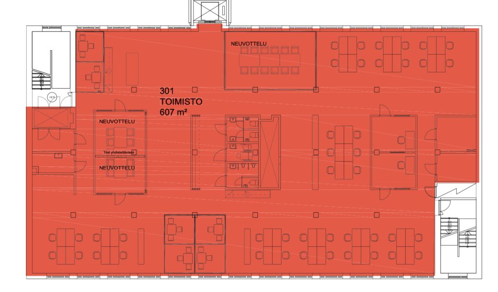 Tämä 607m2 toimistotila sijaitsee kiinteistön 3. kerroksessa. Toimistossa on huoneita, avotilaa sekä omat keittiö- ja wc-tilat. Kuvat ovat havainnekuvia kiinteistön tiloista.