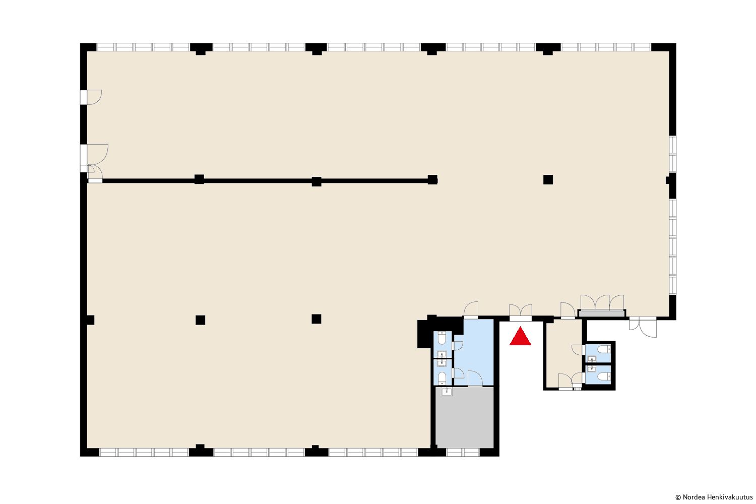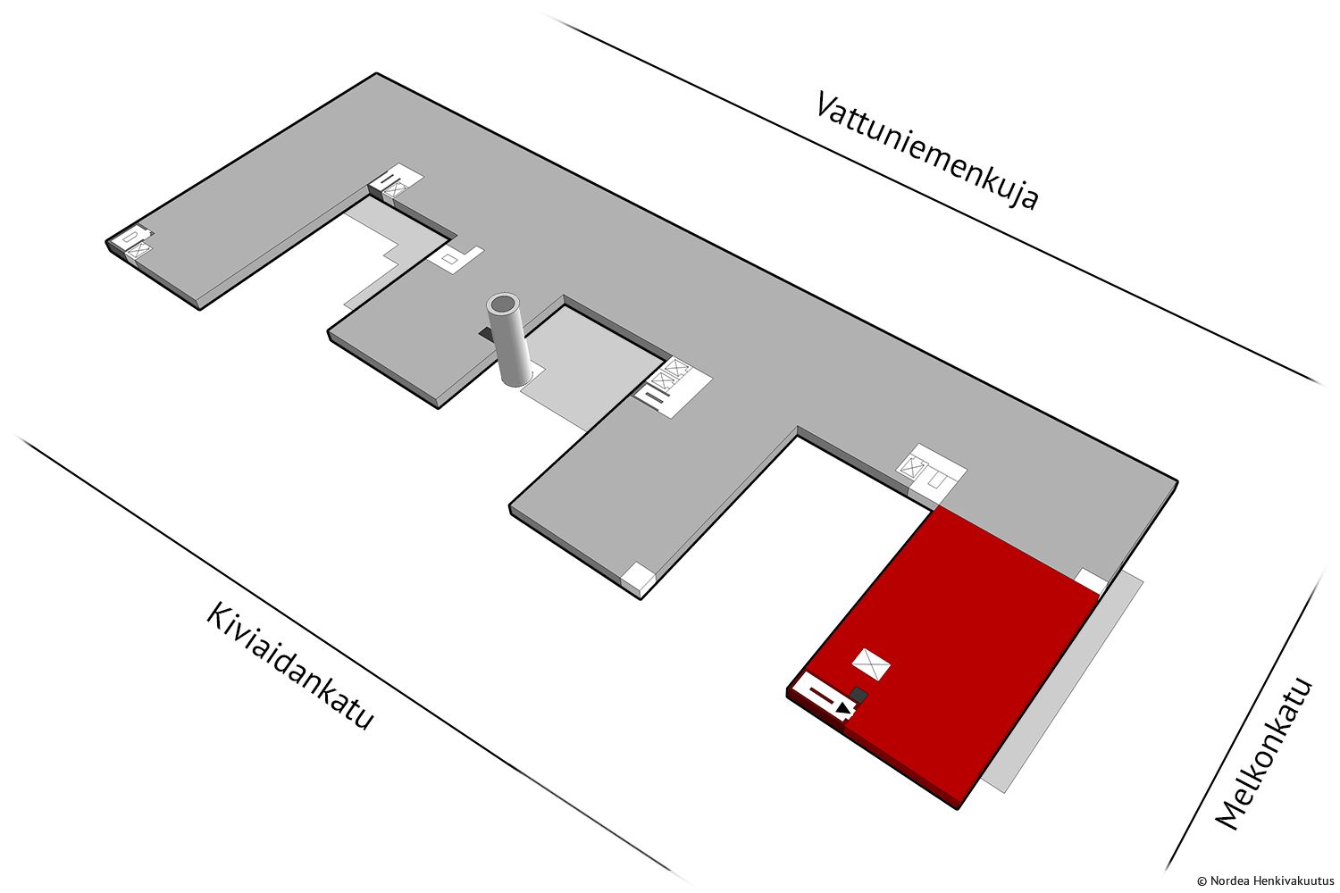 Talon länsipäädyssä sijaitseva valoisa huoneisto, joka koostuu avotilasta ja työhuoneista. Tilaan on tavarahissiyhteys ja sen kautta kulku lastauslaiturille. Nordea Henkivakuutus Suomi Oy:n omistamissa kiinteistössä käytetään vihreää kiinteistösähköä.