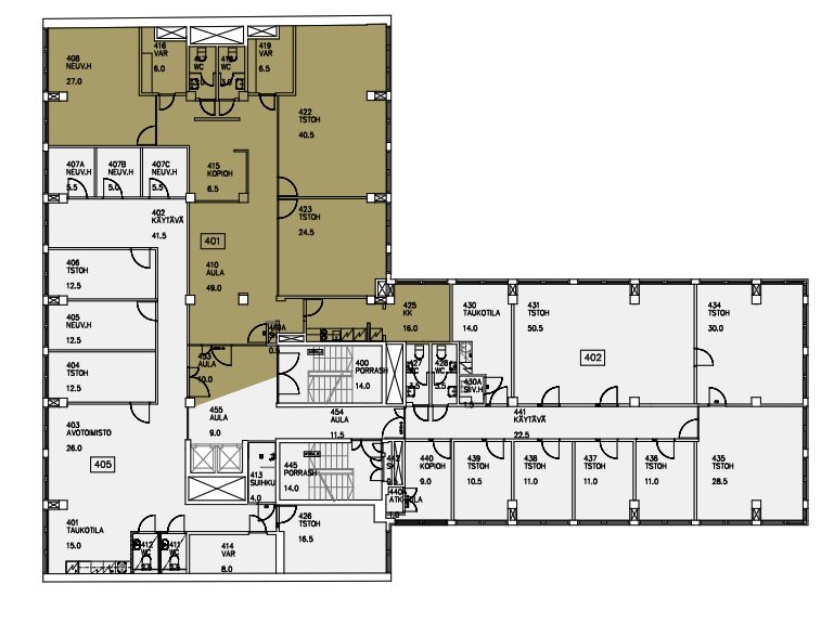 Tämä 200,5 m² toimisto sijaitsee kiinteistön 4. kerroksessa. Tila on huoneellinen, ja siinä on oma keittiö ja wc:t. 190,5m2 toimistoa + 10 m² jyvitetty osuus aulasta. Voidaan yhdistää viereiseen 227,5 m² kokoiseen toimistoon.