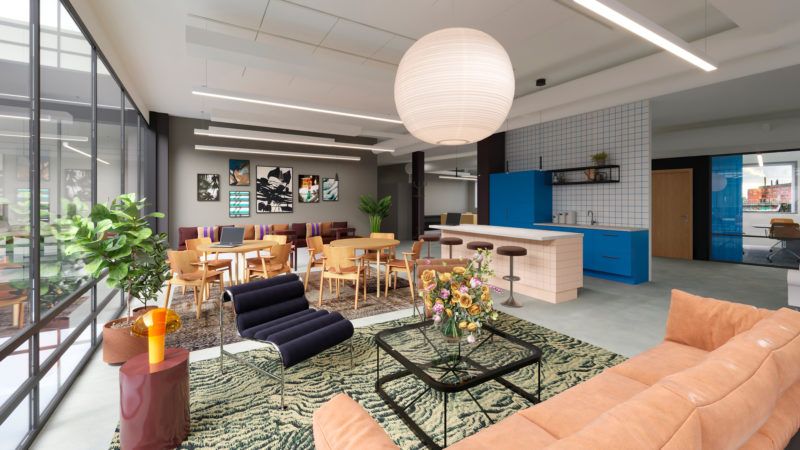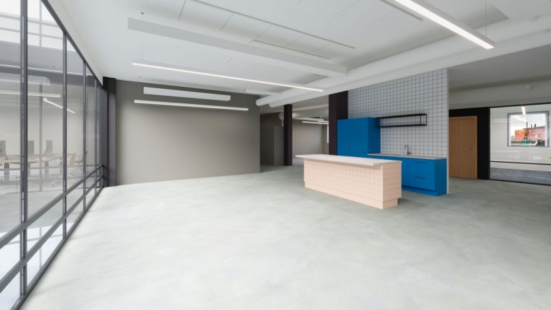 Ylimmän kerroksen avara toimitila, joka tällä hetkellä pääosin avotilaa. Tila on erittäin valoisa, sillä valoa tulee atriumin valokatosta sisään. Tila remontoidaan vuokralaisen tarpeiden mukaan