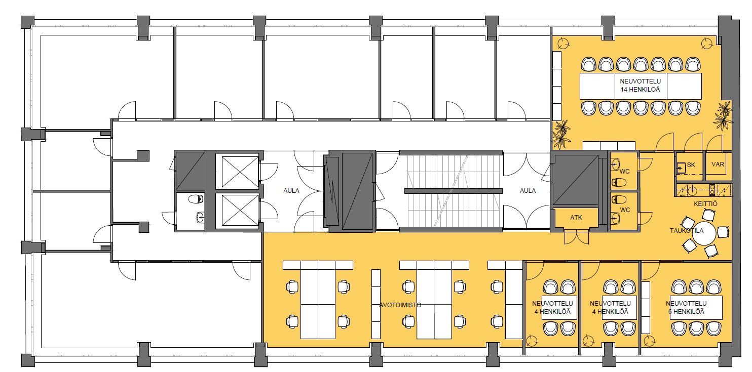 Tämä viidennen kerroksen tila antaa erittäin monipuoliset mahdollisuudet tässä kokoluokassa. L-muotoinen pohja taipuu helposti monitilatoimistoksi eli mukaan saadaan mahtumaan niin ääntä kuin hiljaisuutakin, niin huoneita (oma, tiimi tai kokous) kuin avoakin. Avotilaa on kivasti, kolme työ- tai tiimihuonetta tai vaika Teams-palavereihin, kiva avokeittiö, kaksi wc-tilaa ja kookas kokoushuone tai huone hieman isommalle tiimille. Viidennestä kerroksesta maisematkin ovat jo aika avarat ja upeat.