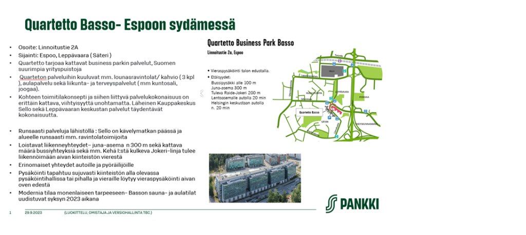 Kiinteistö Quartetto Business park basso sijaitsee erinomaisella sijainnilla Leppävaarassa aivan Kehä 1 ja Turun väylän varrella. Aivan kiinteistön välittömässä läheisyydessä ovat Leppävaaran ja kauppakeskus Sellon palvelut. Lähimmälle bussipysäkille alle 100m ja Leppävaaran juna-asemalle 800m matka.