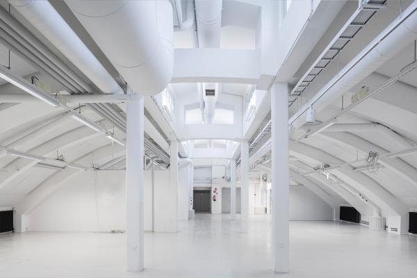 Ylimmän kerroksen korkea tila, johon valoa tulee kattoikkunoista.