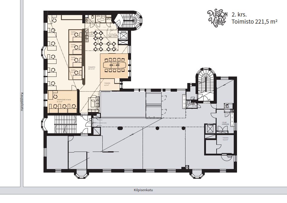 2. kerroksen toimistotila on valoisa läpitalon huoneisto, josta on hienot näkymät Kirkkopuistoon. Tilaan on toteutettavissa kaikki modernin työnteon vaatimukset täyttävä toimisto, jossa estetiikalla on erityinen painoarvo.