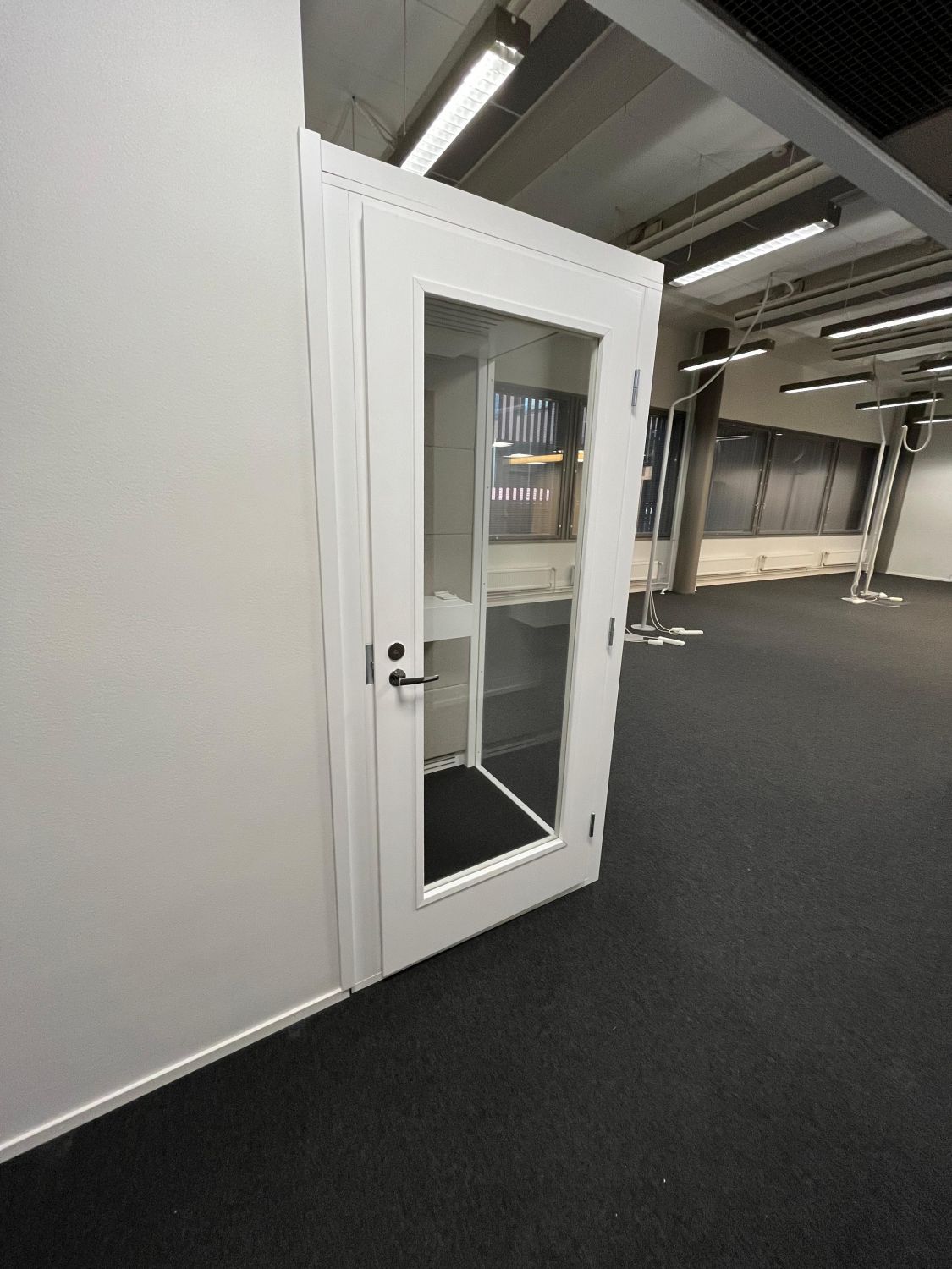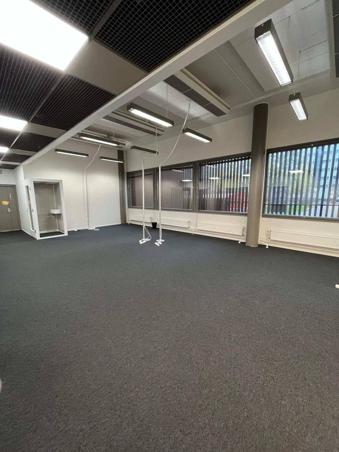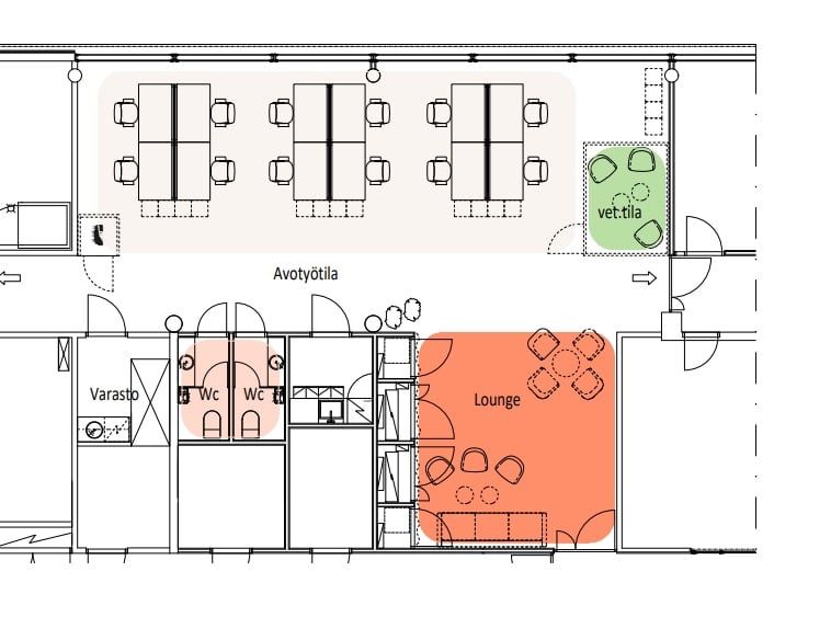 Tilassa valmiina myös myös kaksi vetäytymistilaa (puhelinkoppi ja 2-3 hlö Teams-tila), jotka vuokralaisen käytettävissä. Samoin pieni oma keittiö, kaksi vessaa ja pieni varastohuone löytyy.
