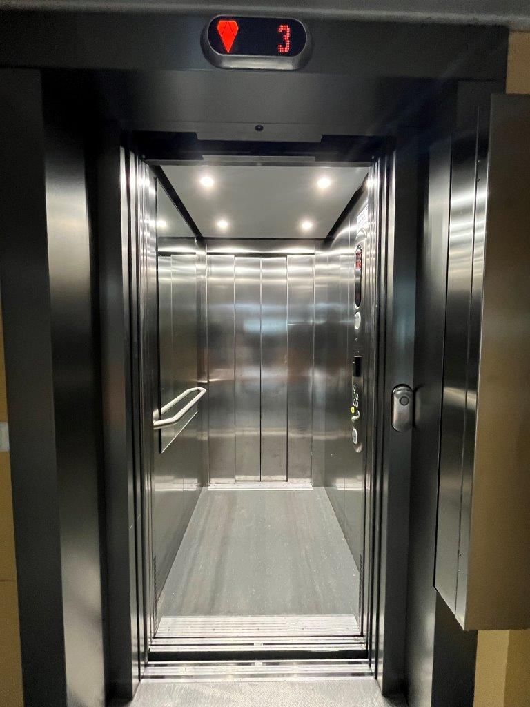 Tilaan nousee hissi sekä kahdet portaat - valoisa ja avara kokonaisuus.