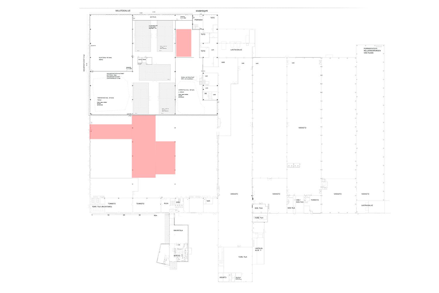 Punaisella värillä merkitty alue on yhteensä noin 1000 m². Tiloja voidaan jakaa ja remontoida vuokranantajan toimesta vastaamaan yrityksen tarpeita erikseen sovitusti. Kiinteistössä on jo tarjolla iso kuntosali GOGO gym, Crossfit, voimistelusali, tanssiva Porvoo harjoittelusali, cheerleading jumppasali, Grindhouse.fight kamppailusali, Boulder kiipeilyseinä, Golfsimulaattori sekä useampi korkealaatuinen Tarmola Padel ry:n padel kenttä.