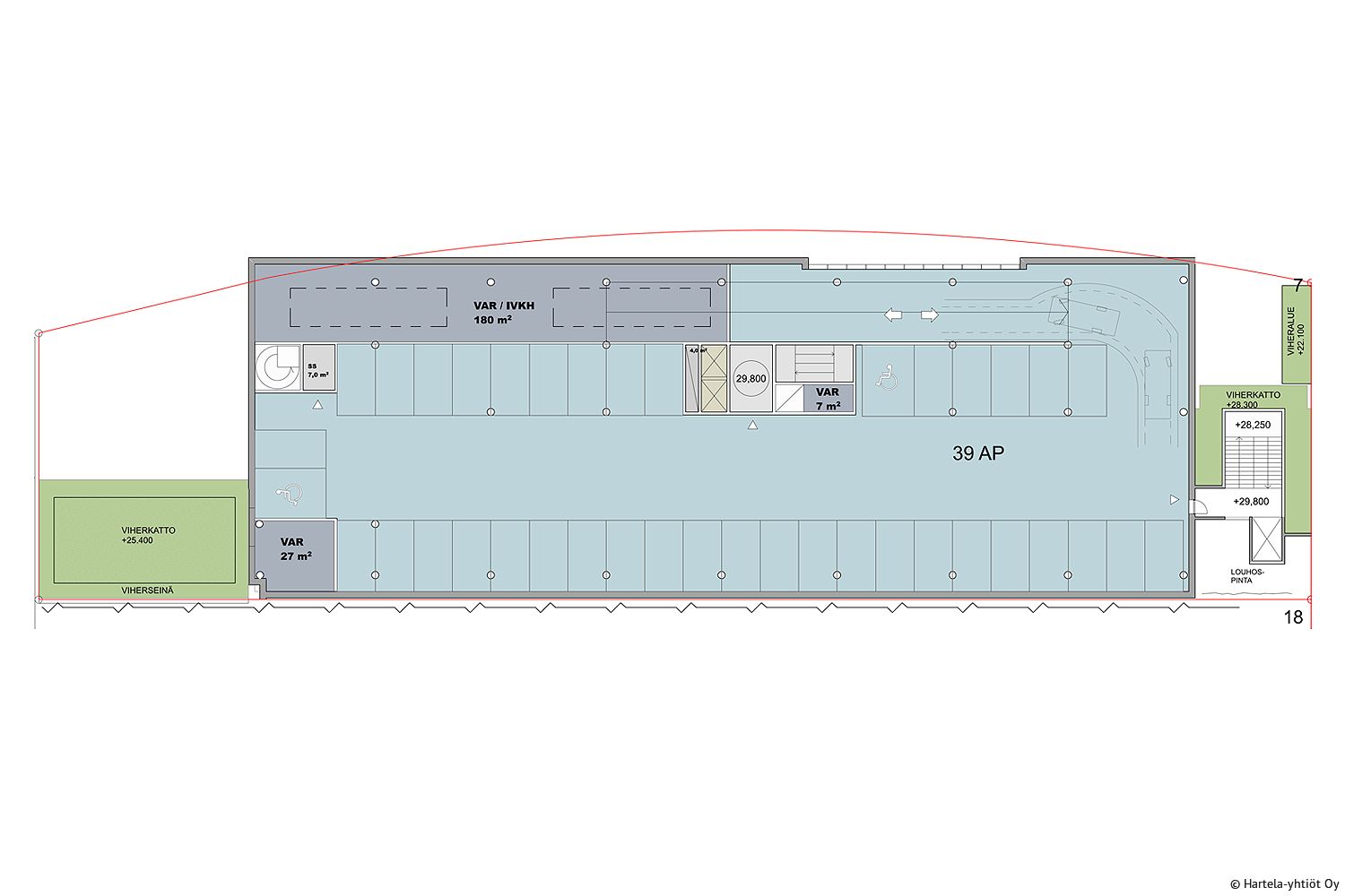 Pysäköintihallin yhteydessä sijaitseva pitkulainen varastotila. Tämä tila vuokrataan ensisijaisesti talon muiden toimitilojen yhteyteen aputilaksi.