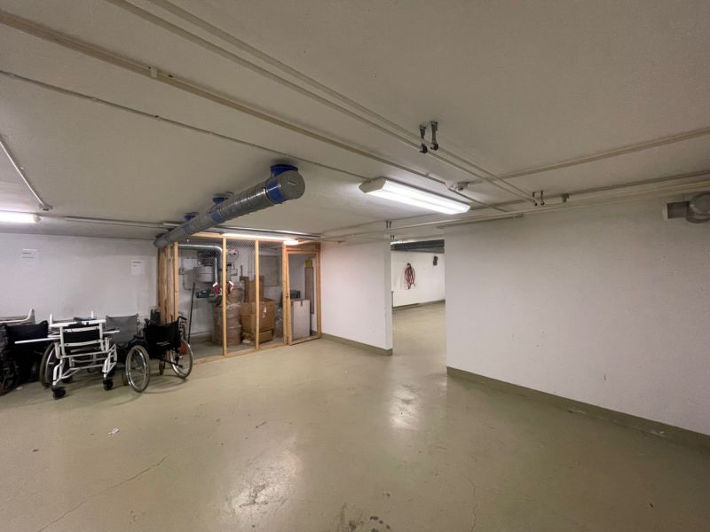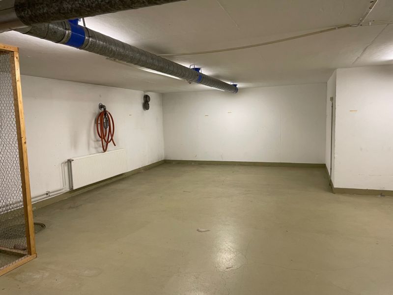 Lämmin väestönsuojatilat kiinteistön kellarikerroksessa. Käynti päädyssä olevan portaikon kautta.
