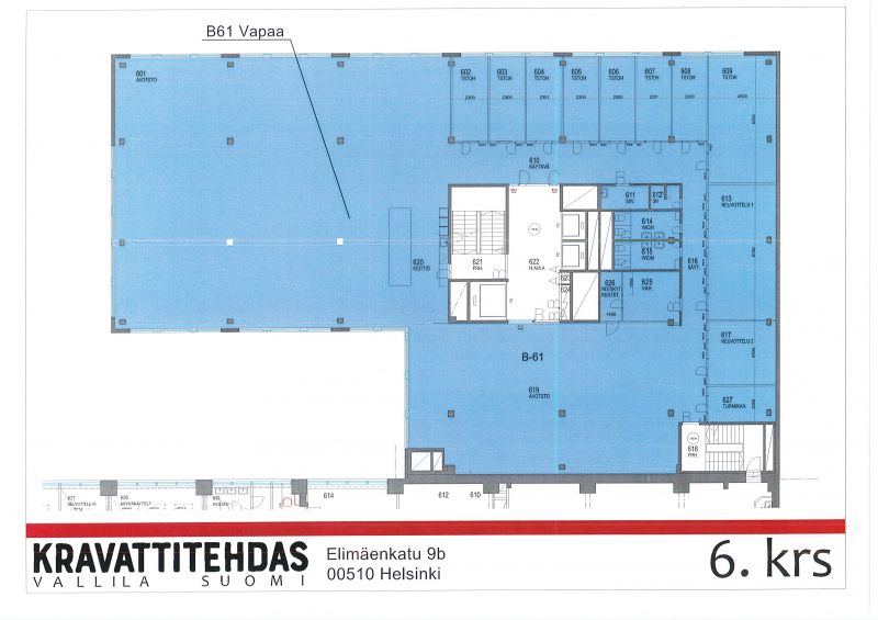 Toimistotilaa 865 m² (tila B61) kiinteistön 6. kerroksessa.