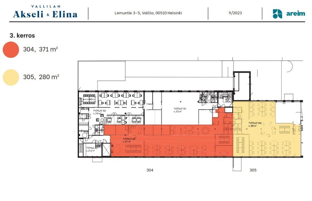 Vuokralle tarjotaan 371-neliöinen toimisto. Tila räätälöidään vuokralaisen toiveiden mukaiseksi. Sisustuksen pintavärit voidaan valita kolmesta valmiista vaihtoehdosta: harmonisen harmaata, leppoisan lämmintä ja skandinaavisen kuulasta.