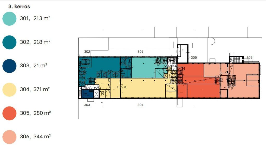 Vuokralle tarjotaan 371-neliöinen toimisto. Tila räätälöidään vuokralaisen toiveiden mukaiseksi. Sisustuksen pintavärit voidaan valita kolmesta valmiista vaihtoehdosta: harmonisen harmaata, leppoisan lämmintä ja skandinaavisen kuulasta.
