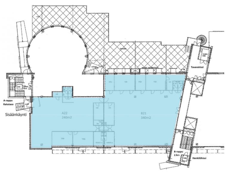 Tässä monikäyttöisessä tilassa on avotilan huonetta, pari pientä varastotilaa, 2 x keittiö- ja 4 x wc-tilaa. Ikkunanäkyvyyttä ja käynti suoraan kadulta.