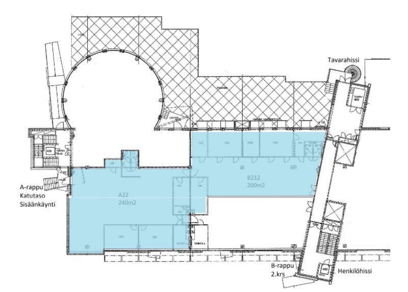 Tässä monikäyttöisessä tilassa on avotilan lisäksi huoneita, varastotilaa, 2 keittiö- ja 4 wc-tilaa. Ikkunanäkyvyyttä ja käynti suoraan kadulta. Tavarahuolto katetun lastauslaiturin (jossa nostin)/tavarahissin kautta.