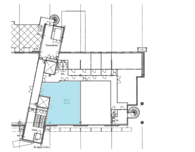 Tämä 2. krs avotila sijaitsee kiinteistön B-rapussa. Sosiaalitilat löytyvät käytävältä. Tavarahuolto hoituu katetun lastauslaiturin (jossa nostin) ja tavarahissin kautta.