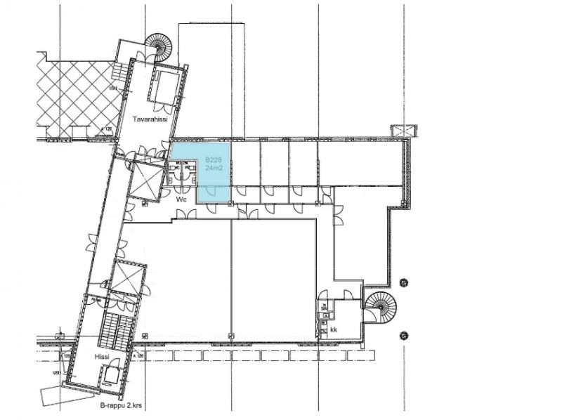 Tämä 2. krs pieni toimisto-/tuotantotila sijaitsee kiinteistön B-rapussa. Sosiaalitilat löytyvät käytävältä. Tavarahuolto hoituu katetun lastauslaiturin (jossa nostin) ja tavarahissin kautta.