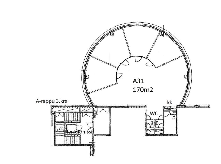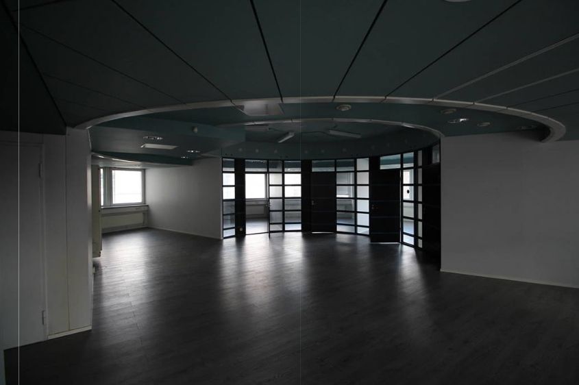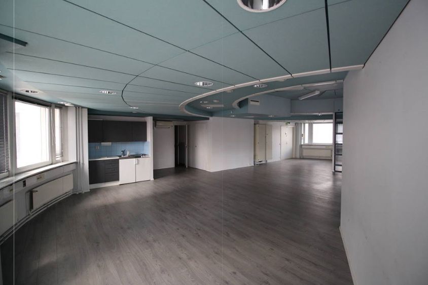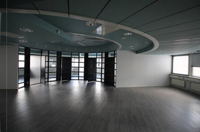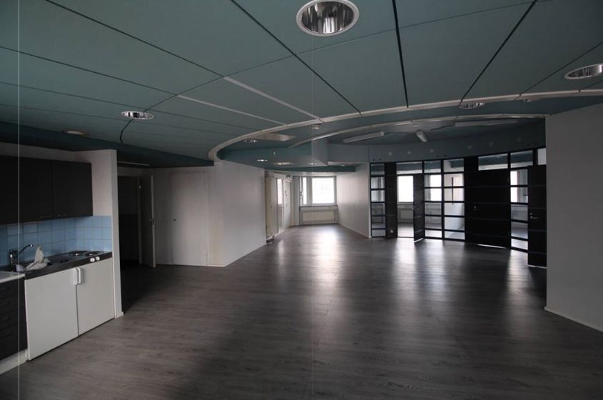 Tässä erikoisen mallisessa toimistotilassa on avotilan lisäksi 4 huonetta, keittiö ja 2 x wc-tila. Tila sijaitsee rakennuksen 3. krs. Käytössä henkilöhissi.