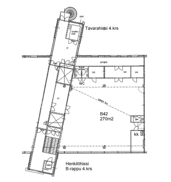Tämä 4. krs kombi-tila sijaitsee kiinteistön B-rapussa. Käynti henkilöhissillä. Osa tilasta erittäin korkeaa. Avotilan lisäksi muutama toimisto-/varastotila, keittiö ja 2 wc-tilaa.