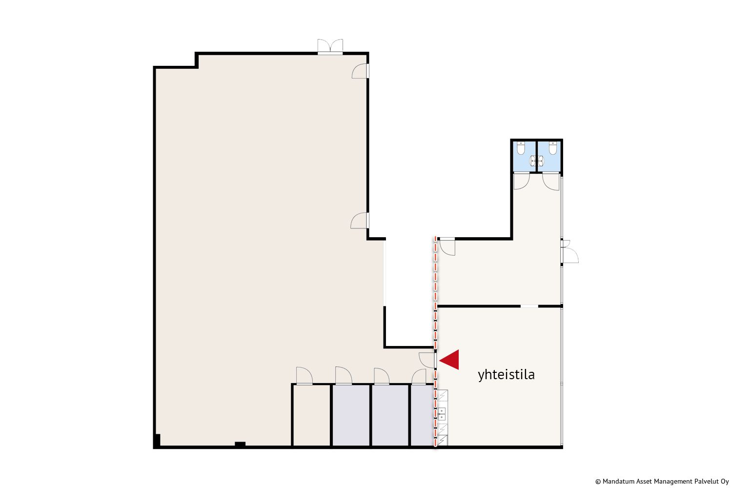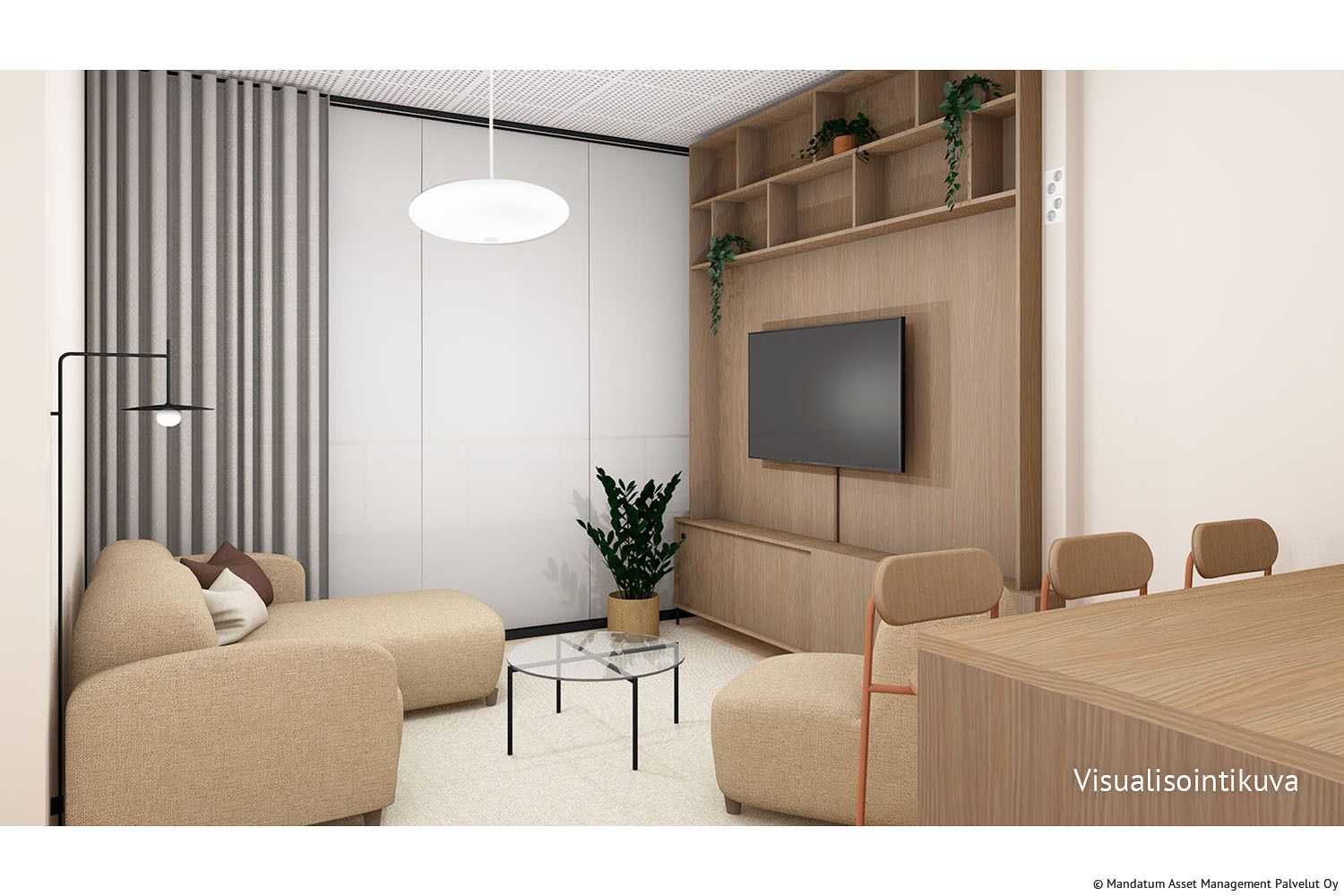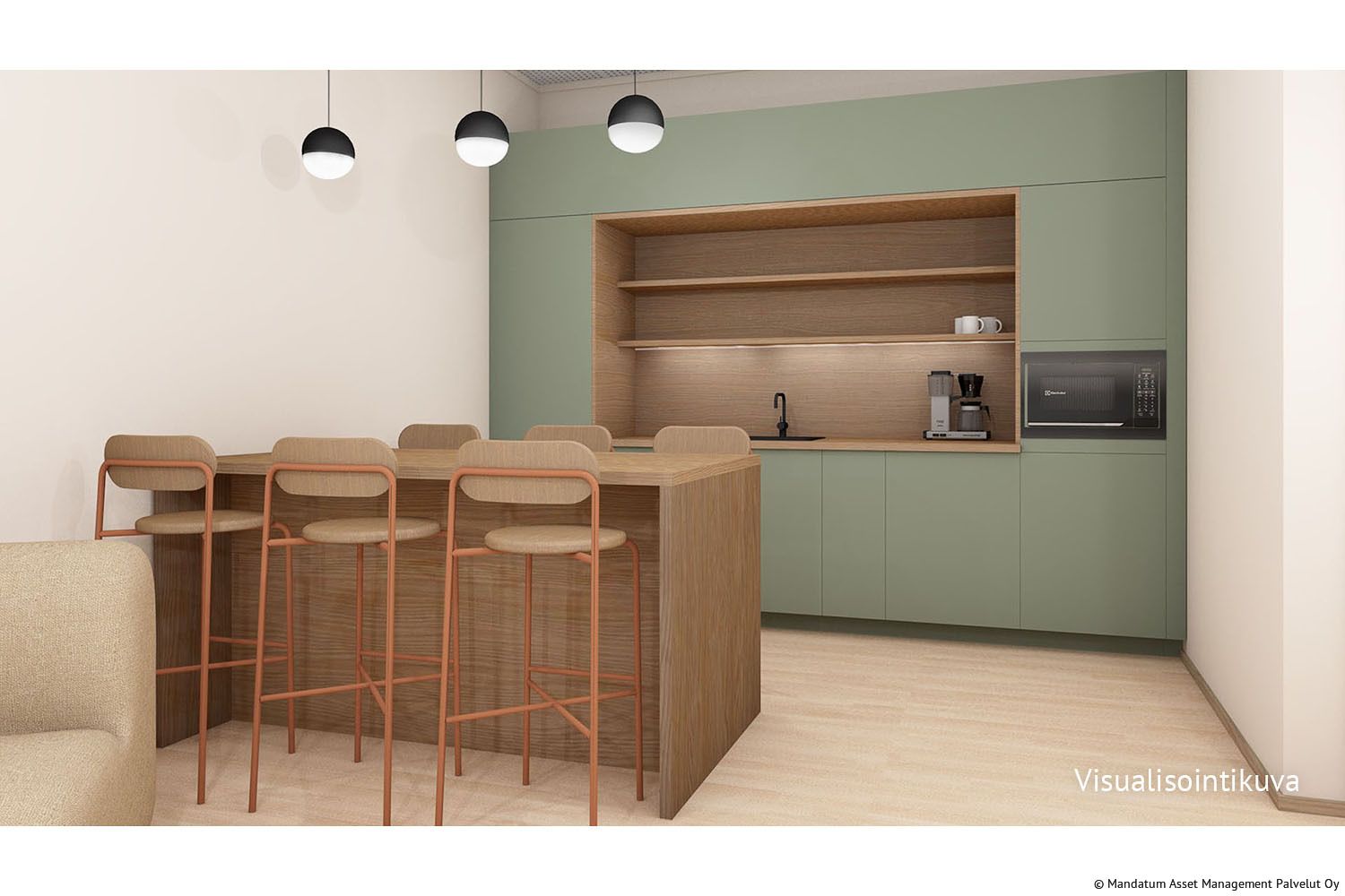 Vuokrataan toimitila 286 m² ja yhteiskäyttötila 98,5 m², josta osa jyvitetään vuokrattavalle tilalle. Yhteiskäyttötila koostuu keittiöstä ja sisääntuloaulasta ja wc-tiloista. Toimitila sopii mm. joogasaliksi tai toimintaterapiaan, katso tilan visualisointikuvat. Tila on muunneltavissa tarpeen mukaan. Tila sijaitsee uuden toimistomaailman yhteydessä. Yhteiset tilat koostuvat tilavasta keittiöstä, sisääntuloaulasta ja wc-tiloista.