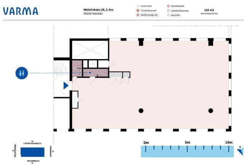 Kiinteistö Malminkatu 28/ Lapinrinne 3 on valmistunut 1977 ja saneerattu 2015. Kiinteistön sijainti on erinomainen aivan Kampin metroaseman, bussi- ja raitiovaunuliikenteen äärellä, joka mahdollistaa sekä työntekijöiden että asiakkaiden sujuvan saapumisen toimistolle. Kampin kauppakeskuspalvelut liikkeineen ovat aivan kulman takana.