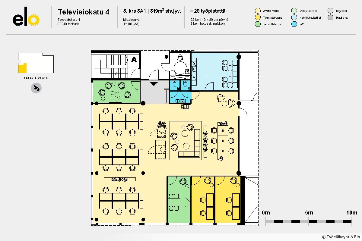 Muuttovalmis toimistotila, johon mahtuu vähintään 28 työpistettä, avotilassa 18 työpistettä ja 6 hot deskiä, lisäksi kolme vetäytymistilaa. Kahvilakeittiön yhteydessä moderni taukotila sekä viihtyisä kohtaamistila – sujuvaan yhteistyöhön ja virkistäviin taukoihin. Tiloista avarat näkymät kohti itää ja etelään ja vastapäistä rakennusta. Kaikissa tiloissa mm. tekstiilipalamatot, modernit vaaleat taukokeittiöt vinyylilankkulattioin sekä energiatehokas led-valaistus. Käytössä Pasilan Linkin monipuoliset liiketoiminnan tukipalvelut.