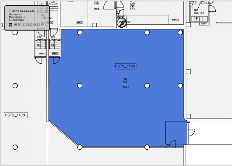 Vuokrattavana kiinteistön ensimmäisen kerroksen sijaitsevaa siistiä varastotilaa. Tilan korkeus on noin 4,5 metriä. Tilassa on nosto-ovi (leveys 250cm ja korkeus 315cm), lattiakaivo.