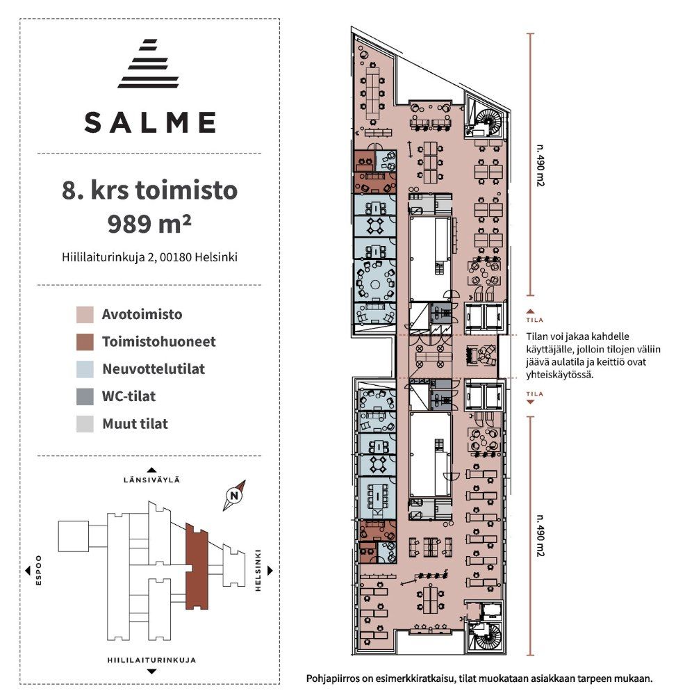 Vuokrattavana moderni tasokas 8. kerroksen 989m2 toimistokokonaisuus Salmisaarenaukiolla. Kuvat ovat referenssikuvia asiakkaille toteutetuista ratkaisuista.