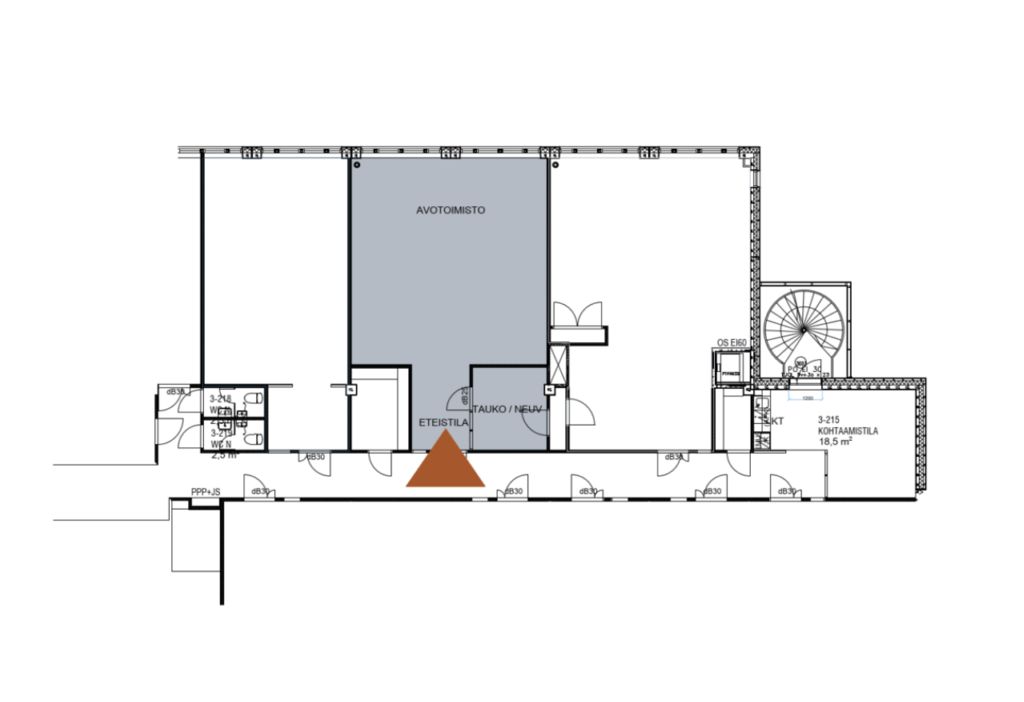 Tämä 68,5 m² toimistotila sijaitsee kiinteistön 3. kerroksessa. Tila on avotoimisto yhdellä neuvotteluhuoneella. Käynti tilaan yhteiskäytävältä, käytävän varrella olevien yritysten käytössä on kaksi yhteiskäyttöistä keittiötilaa, taukotila, wc:t sekä varattava neuvottelutila.