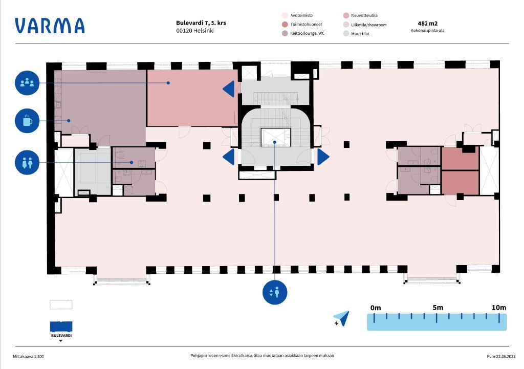 Vuokrattavana on 7. kerroksen 483m2 tila. Kuvat ovat esimerkkikuvia asiakkaille toteutetuista ratkaisuista.