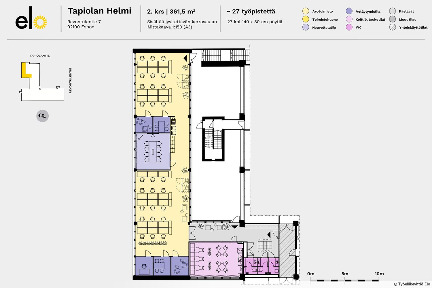 Kauniilla puistomaisemalle varustettu läpitalon muuttovalmis toimisto. Viisi vetäytymistilaa ja yksi 8 hengen neuvotteluhuone. Neuvotteluhuone jakaa avotoimiston kahteen erilliseen osioon. Vuokrattavissa osana 642m2 tilaa jolloin muodostuu yhteensä 1003,5m2 toimisto.
