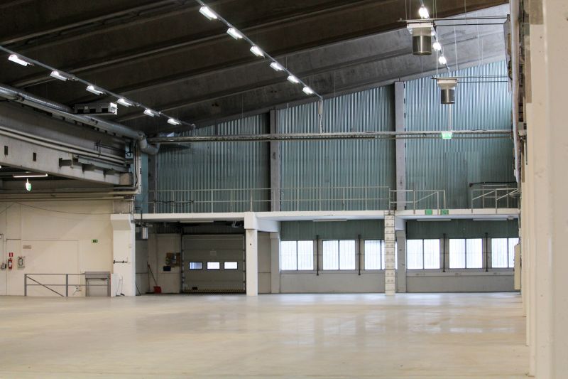 korkeaa varasto/tuotantotilaa 1813m2, vapaa korkeus 5-10m. Viistokatto. Toisessa päässä hallia maantasosta iso nosto-ovi/ajo sisään, toisessa päässä lastaustasku.