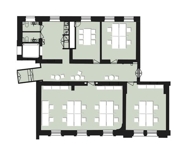 Tässä toisen kerroksen toimistossa on erikokoisia huoneita, joista suurimpaan mahtuu arvatenkin jopa 10 työpistettä. Lisäksi löytyy keittiö / taukotila ja wc-tilat (2). Kesäkuumalla osaa arvostaa että tiloissa on viilennys.
