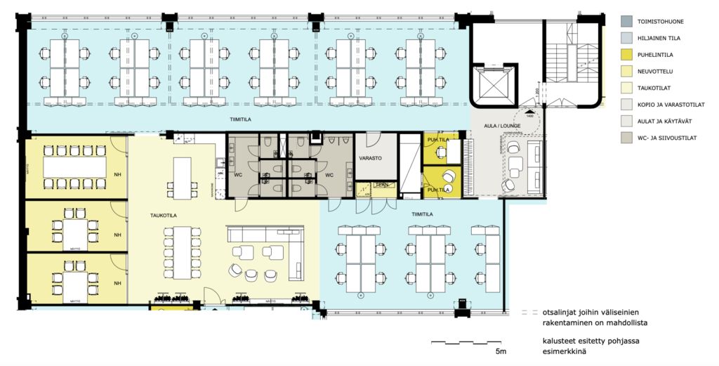 Toimistotilojen suunnittelussa panostettiin nykyvaatimusten mukaiseen muunneltavuuteen, viihtyisyyteen, tehokkuuteen ja laatuun. Kaikki yhteiskäytössä olevat neuvottelutilat, auditorio, kuntosali ja ravintola saivat uuden ilmeen. Myös pyöräilijät huomioitiin uusilla lukituilla parkkitiloilla sekä sosiaalitiloilla.