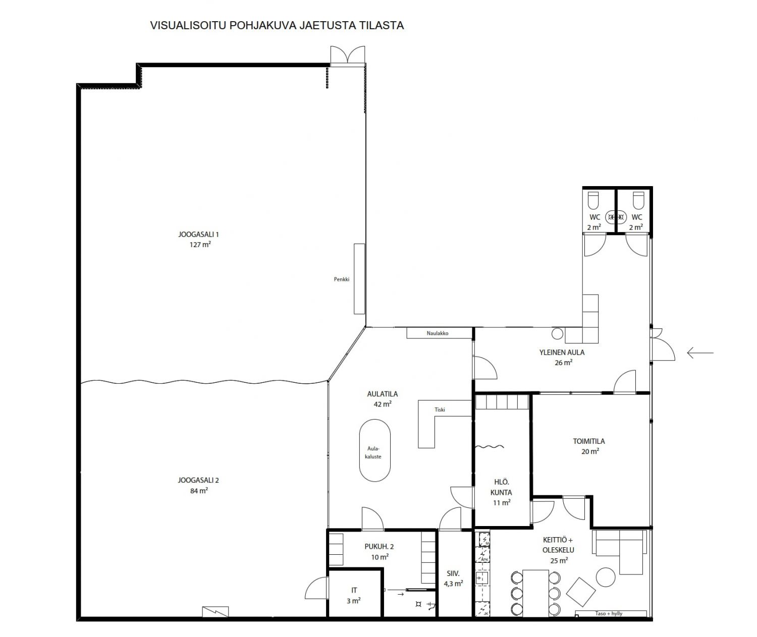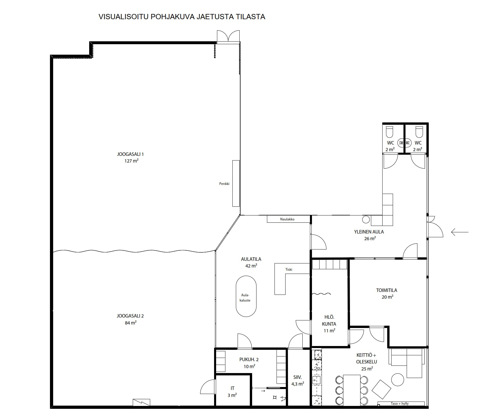 Vuokralainen voi suunnitella toimitilan omalle liiketoiminnalle sopivaksi. Visualisoiduista havainnekuvista näet miten tilan voisi muuttaa joogasaliksi tai muuhun vastaavaan toimintaa. Pohjakuvissa näkyy nykyinen tilanne sekä visualisoidut vaihtoehdot. Viereisessä tilassa vuokralaisena toimii hieroja. Hermannissa käy päivittäin noin 1000 henkilöä. Kauppakeskus on auki maanantaista sunnuntaihin klo 22 asti. Tämän tilan läheisyydessä on asiakashissi. Tila on heti vapaa.