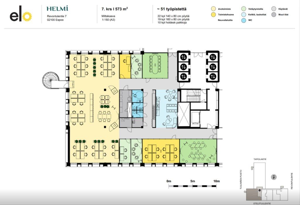 Vuokrataan tasokkaasti saneerattua valoisaa, modernia ja jäähdytettyä kombitoimistotilaa. Vuokrattavana on 7. kerroksen 573 m² toimistotila.