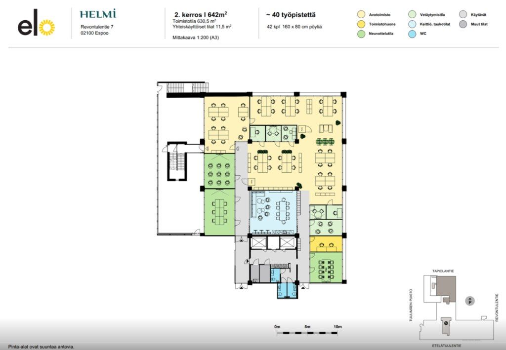 Vuokrataan tasokkaasti saneerattua valoisaa, modernia ja jäähdytettyä kombitoimistotilaa, vuokrattava tila on 2. kerroksen 642 m² toimistotila.
