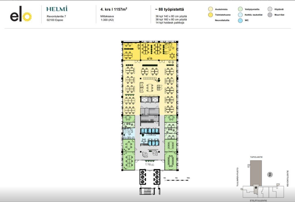 Vuokrataan tasokkaasti saneerattua valoisaa, modernia ja jäähdytettyä kombitoimistotilaa. Vuokrattavana on 4. kerroksen 1157 m² toimistotila.
