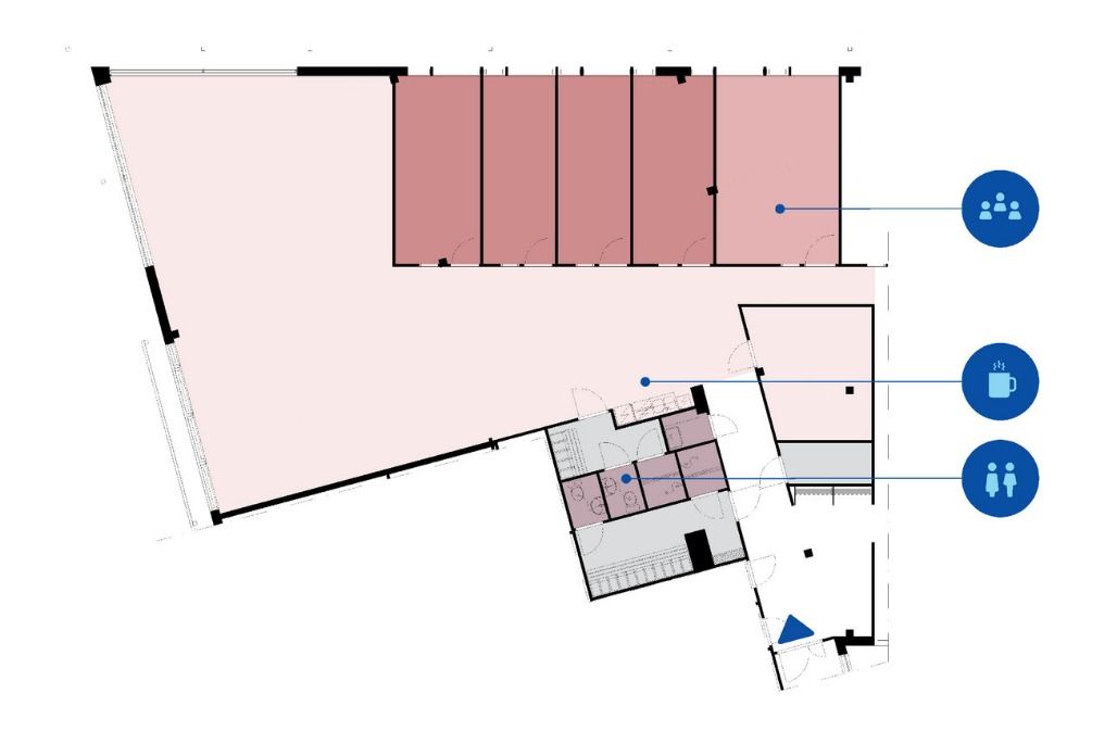 Tämä toimisto tarjoaa monipuolisen ympäristön työskentelylle mahdollistaen tehokkaan toiminnan. Rakennuksen päädyssä sijaitsevassa tilassa on valoisaa avokottoria, jota täydentävät työ- ja neuvotteluhuoneet. Tilassa on oma minikeittiö sekä pukuhuoneet, joissa suihkut sekä wc:t.