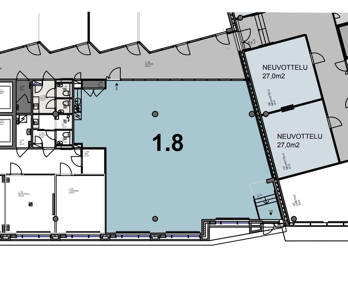Katutason valoisa avotoimistotila aivan neuvottelutilojen tuntumassa. Avokonttorissa kommunikointi on tehokasta, ja päivä kulkee sujuvasti. Tämän kokoluokan toimistoja vapautuu harvoin kiinteistöltä, joten ole nopeasti yhteydessä! Tilassa on minikeittiö, ja wc-tilat löytyvät heti toimiston vierestä. Ilmoituksen kuvat ovat kiinteistön muista tiloista.