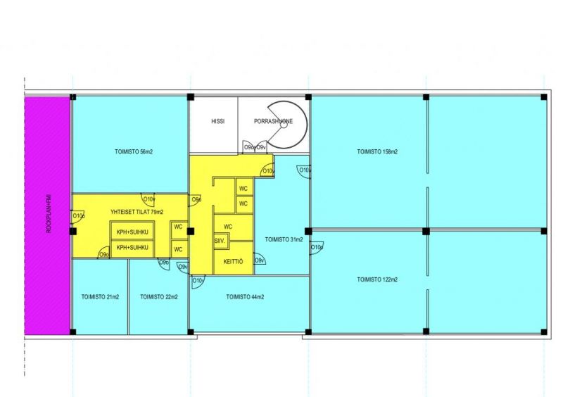 Tilakoot 21-158m2. Yhteiset neuvottelu-, keittiö-, ja wc-tilat.