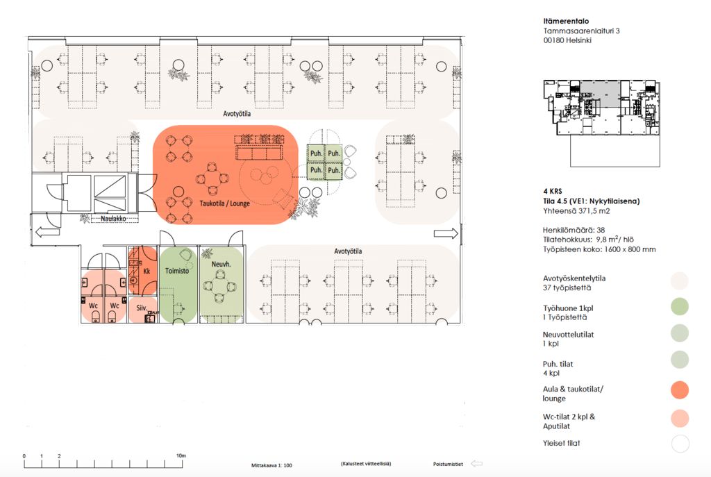Tämä 371,5m2 toimistotila sijaitsee kiinteistön 4. kerroksessa. Toimistossa on avotilaa, työhuone ja neuvotteluhuone sekä omat keittiö- ja wc-tilat.