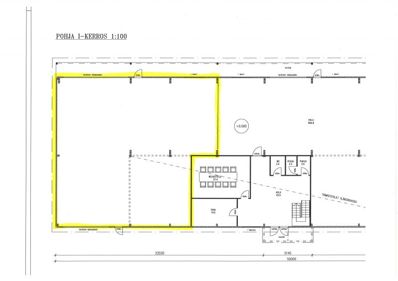 Läpiajettavan hallin vapaa korkeus on pääosin n. 4,5m ja yksi kulma-alue on matalampaa ja siihen voidaan rakentaa toimistotilat.