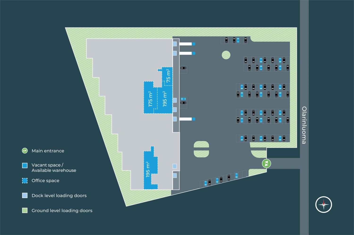 Kohteen käyttäjiä palvelee lounasravintola. Kiinteistön katolla on edustussauna kattoterasseineen. Kiinteistössä on runsaasti pysäköintipaikkoja ja piha-alue mahdollistaa myös rekkojen liikennöinnin varastolle.