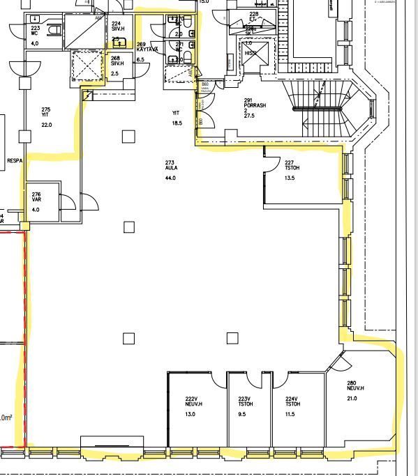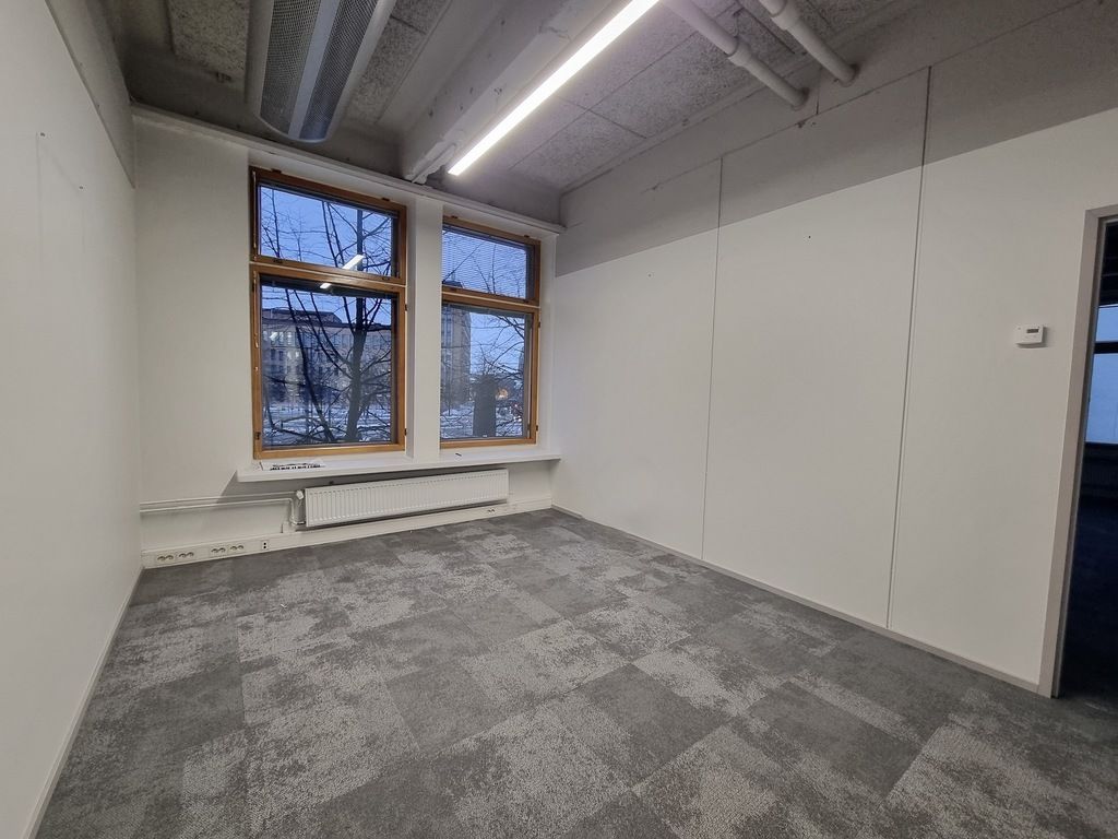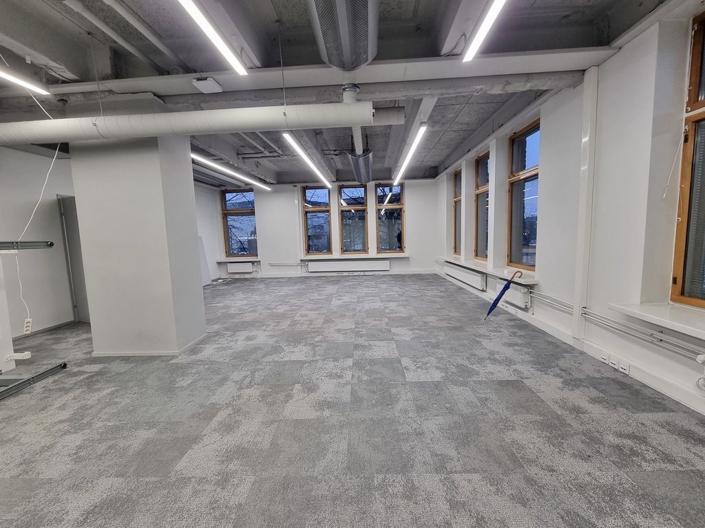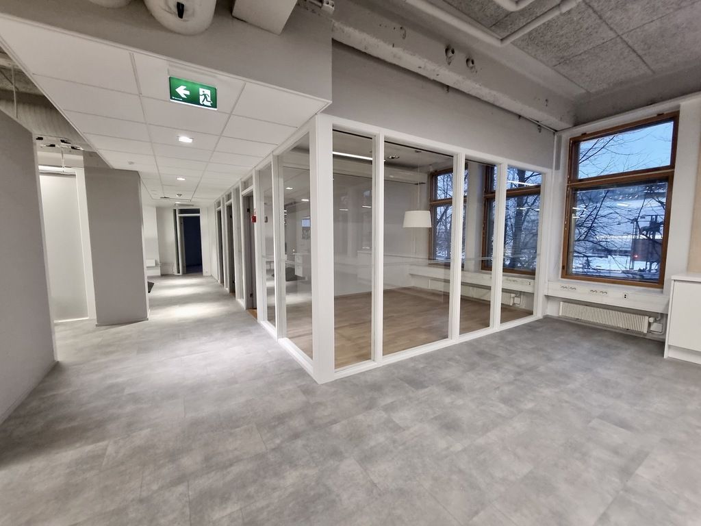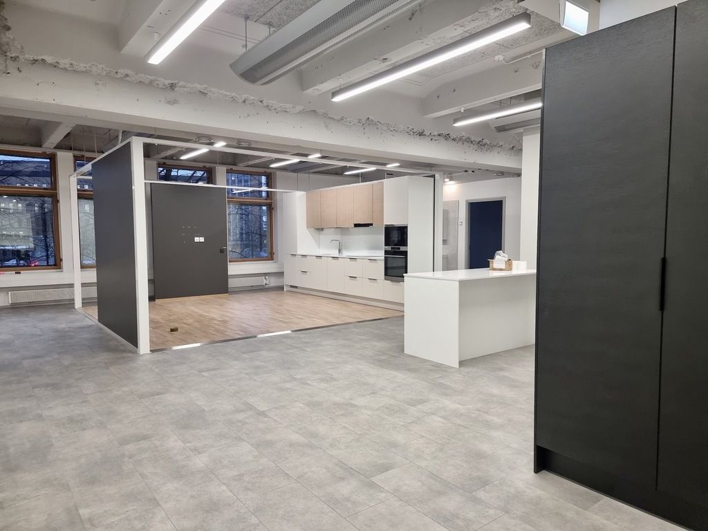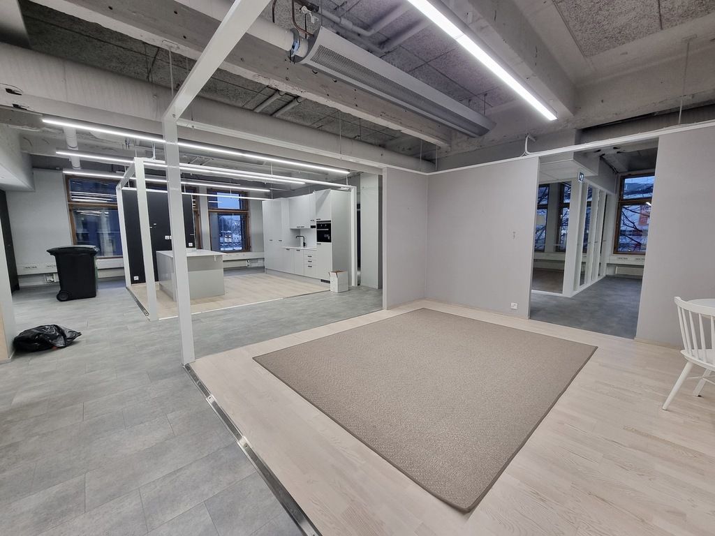 Tämä 320m2 toimistotila sijaitsee kiinteistön 2. kerroksessa. Toimistossa on avotilaa, muutama huone sekä omat keittiö- ja wc-tilat. Kuvissa näkyvät keittiöt tilan keskellä ovat mallikappaleita, jotka puretaan.