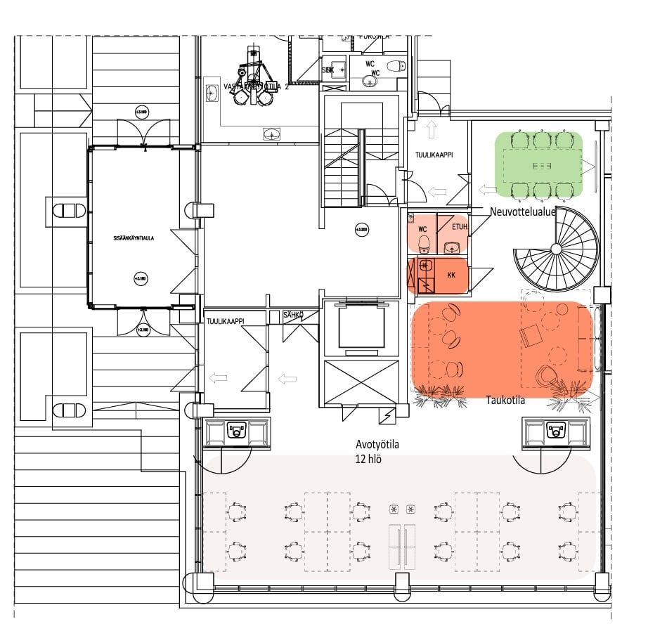 Tämä ensimmäisen kerroksen tila sopii moneen eri tarkoitukseen. Tilaa voi hyödyntää toimistona, sowroomina tai vaikkapa liiketilana. Tila tullaan myös muokkaamaan tulevan käyttäjän tarpeisiin.