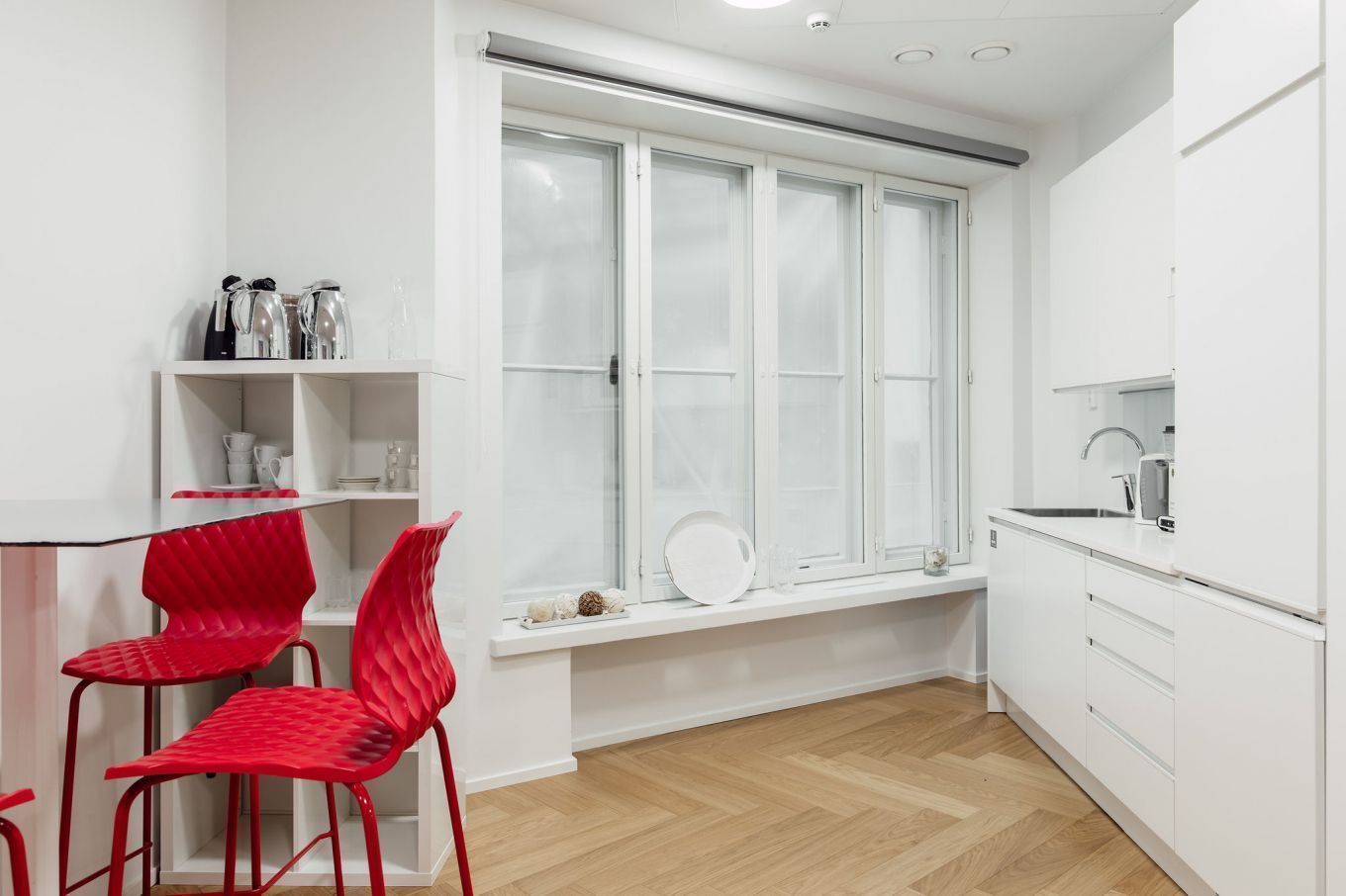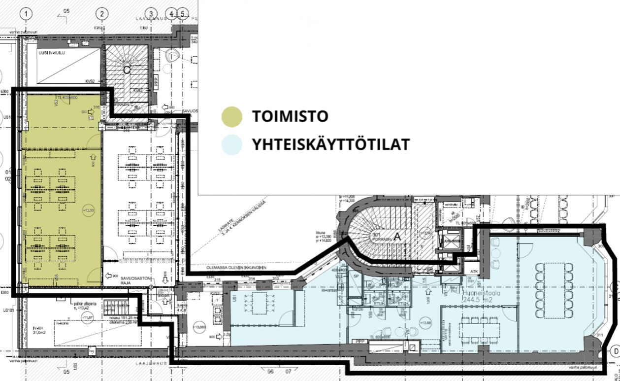 Tässä vapaana olevassa tilassa on 60 m2 toimistotila omassa käytössä sekä toisen vuokralaisen kanssa hulppeat, kalustetut yhteiskäyttötilat, joista jyvitetty osuus on 86,50 m2.