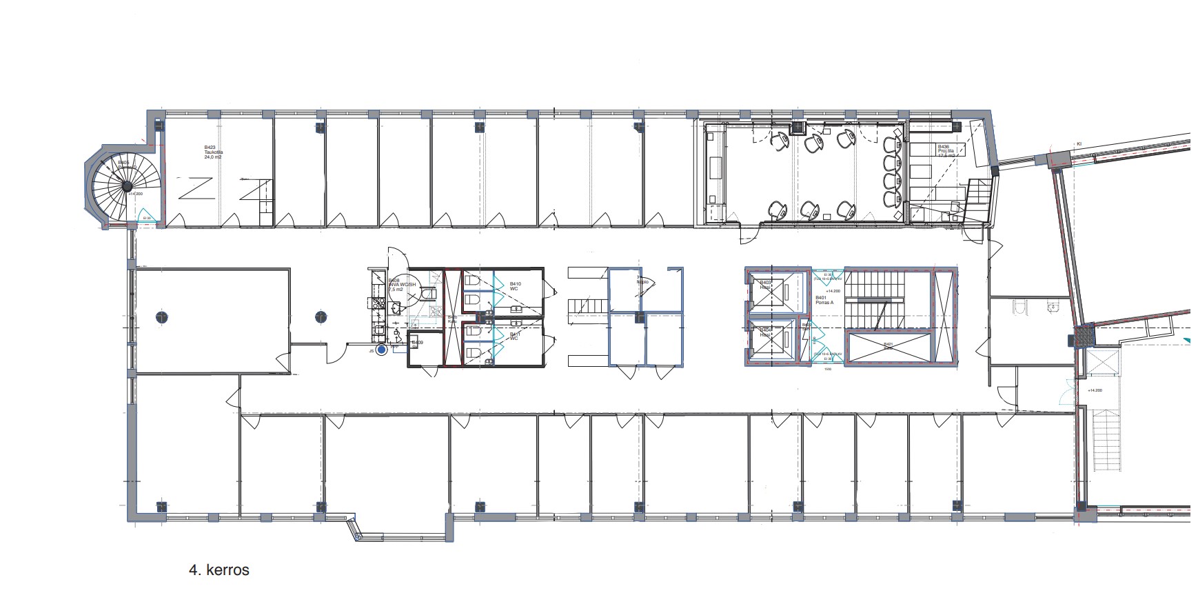 Tätä neljännen kerroksen toimistotilaa reunustavat erikokoiset työ- ja neuvottaluhuoneet. Tilan keskiosassa on taukotilaa keittiöineen, varasto-/kopiointitilia sekä wc-tilat. Erikoisuutena tässä tilassa on äänieristetty studio/katselutila, joka käsittää 45 m2 sekä projektoritila (17,5 m2). Ilmoituksen kuvat eivät välttämättä vastaa juuri tätä tilaa.