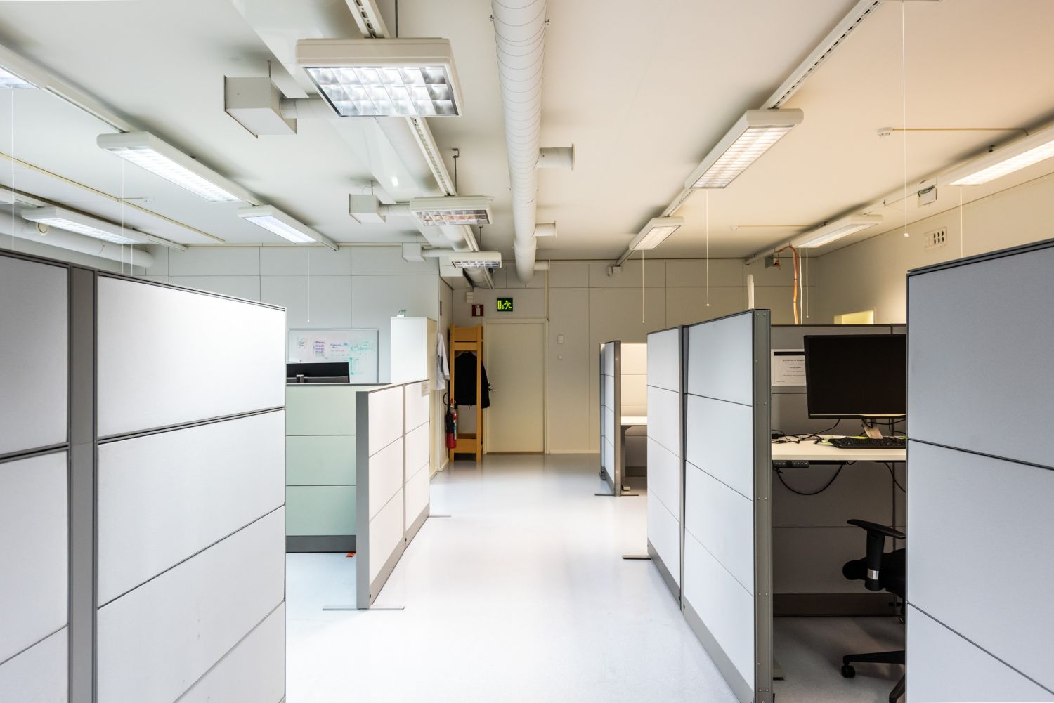 Toimistotilat ovat rakennuksen toisessa kerroksessa ja nosto-ovellinen tuotantotila katutasossa.