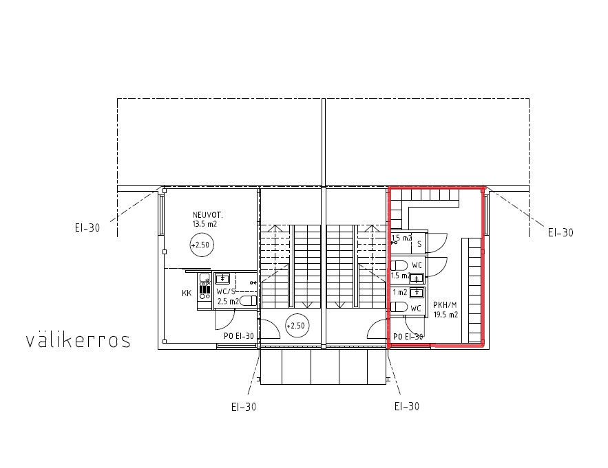 - 2 wc:tä kerroksen aulassa, välikerroksessa sosiaalitilat suihkuilla.