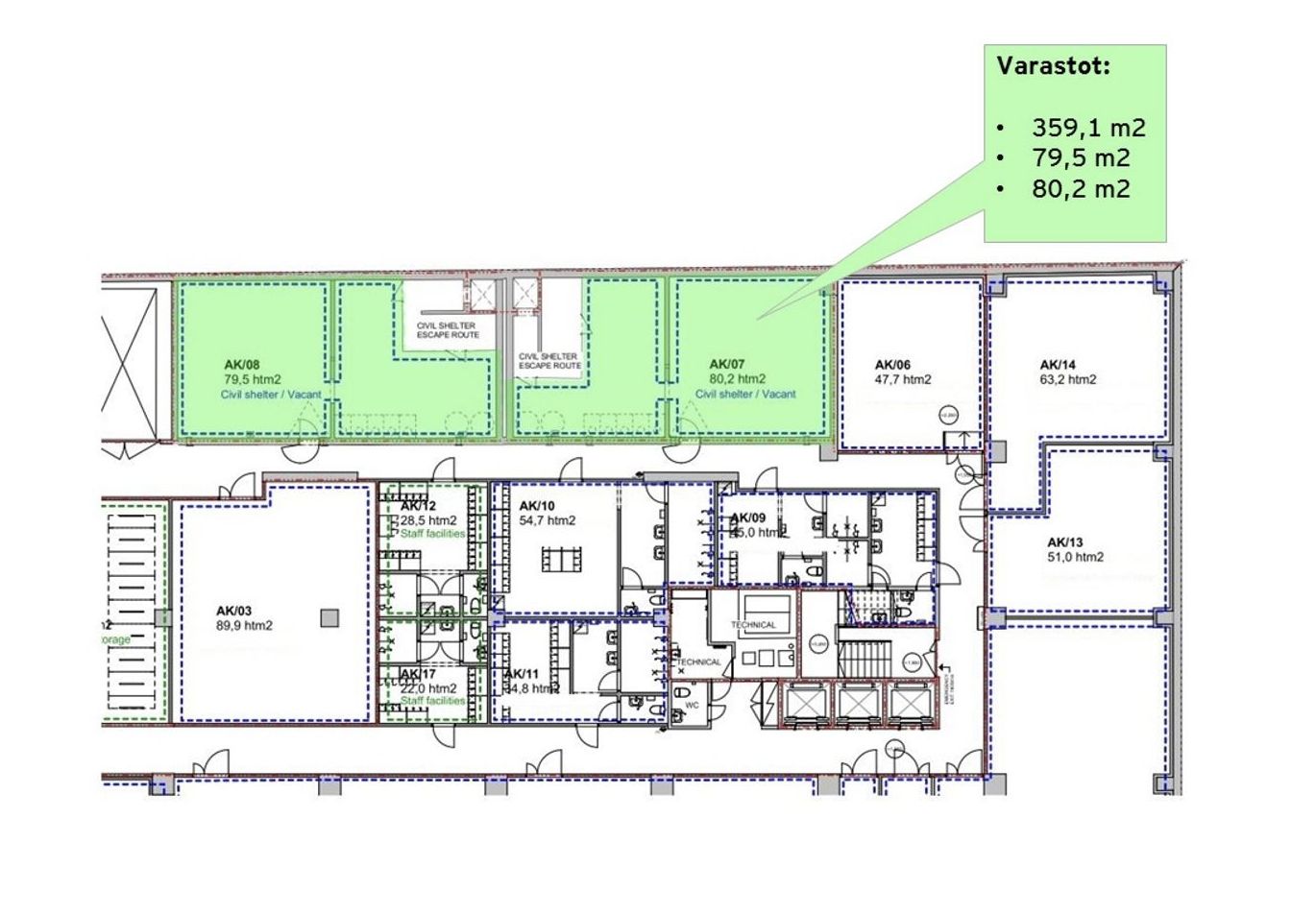 Vapaat tilakoot: 359,1 m2, 79,5 m2 ja 80,2 m2. Varastotilat ovat -2 kerroksessa johon on henkilö-/tavarahissiyhteys.